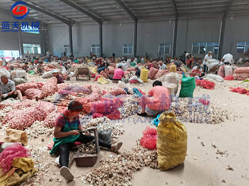 工人們先把蒜蒂去除,去除的大蒜通過傳送帶送往機(jī)器中剝皮,分瓣、切片