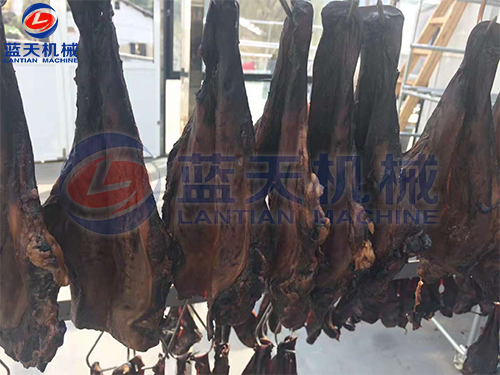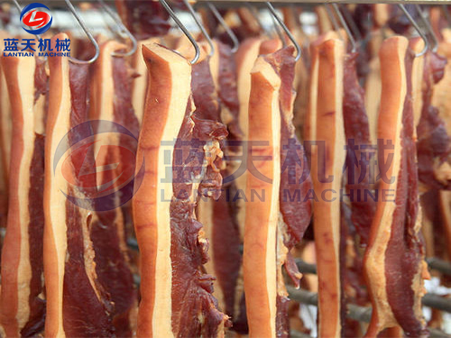 一次烘制。將五花豬肉放進臘肉烘干房內(nèi),溫度50~70℃,烘烤2.5~3.5小時。